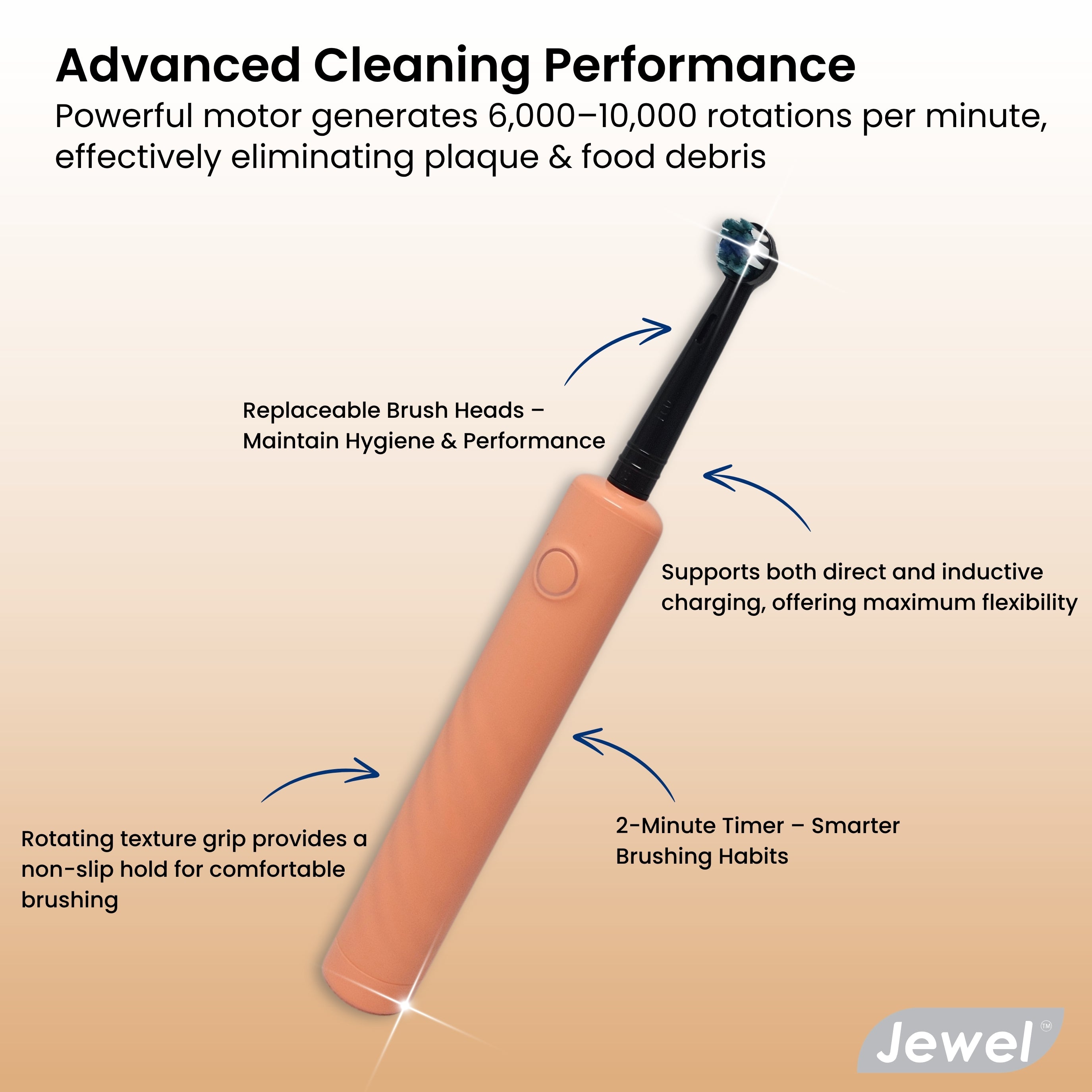 Experience the perfect blend of power, elegance, and convenience with the Jewel TP139 Power Toothbrush. Designed to deliver exceptional cleaning performance, this toothbrush features a powerful rotating motor, smart LED power button, and a sleek, ergonomic design making it the ultimate choice for daily oral hygiene.
